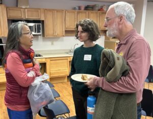 Gill Finance Committee Chair Claire Cheng, left, Greenfield City Councillor Sara Brown, center, and Gill Select Board member John Ward connect during an MMA Legislative Breakfast Meeting in Athol on Oct. 3.