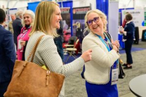 Needham Town Manager Katie King, left, and Grafton Finance Director and Town Accountant Mary Lauria chat during the Trade Show reception at Connect 351 in 2025.