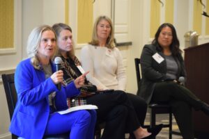 Medford Mayor Breanna Lungo-Koehn, far left, speaks during a panel discussion about overcoming challenges and building resilience as public servants during a meeting of Women Leading Government on Nov. 13 in Devens. Other speakers included, left to right, North Andover Town Manager Melissa Murphy Rodrigues, Nantucket Town Manager Libby Gibson, and South Hadley Town Administrator Lisa Wong, who moderated the panel discussion.